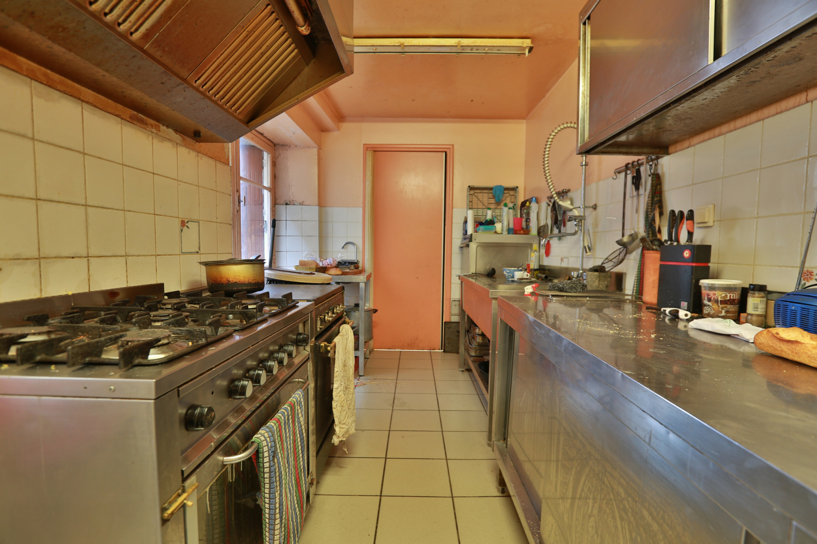 Le commerce comprend un équipement de cuisine simple mais complet pour proposer une cuisine familiale. (piano, hotte, four, lave main, évier, rangements inox...)