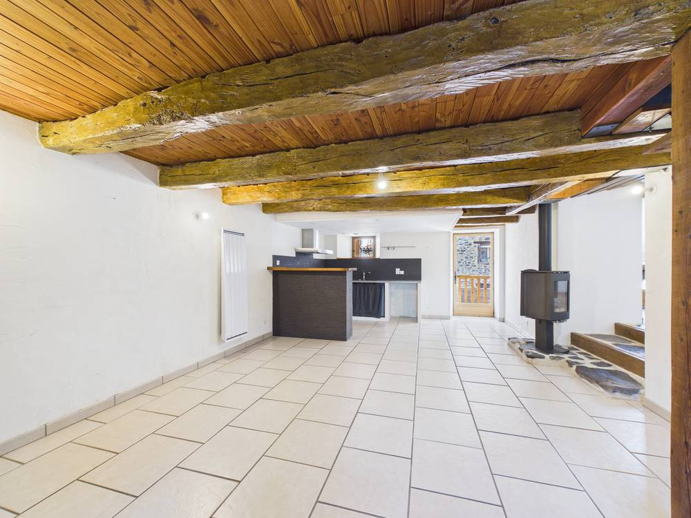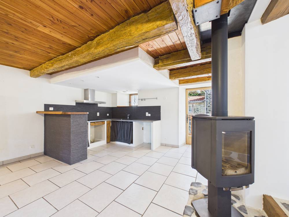 Au rez-de-chaussée, deux pièces de vie communicantes et lumineuses, avec poêle à bois central et espace cuisine ouvert, créent un cadre convivial et chaleureux.