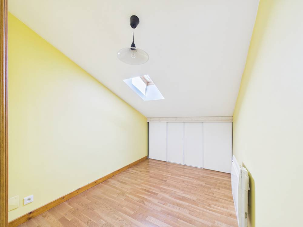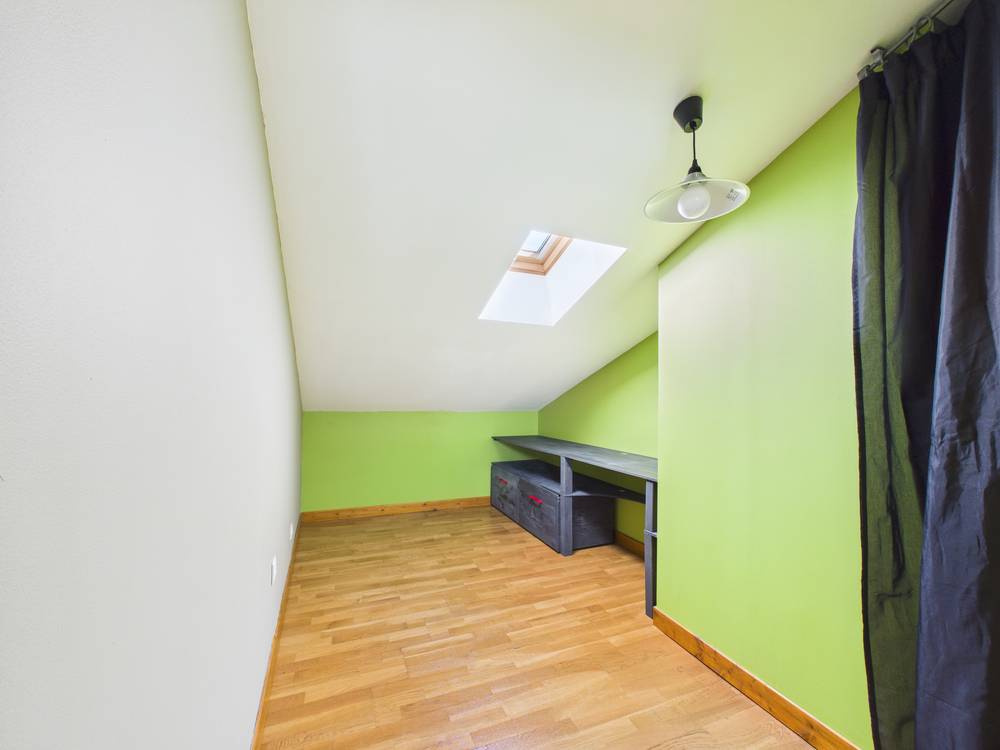 Le 1er étage, accessible par un escalier élégant en bois et métal, comprend une chambre confortable, une salle d’eau spacieuse et un WC séparé. Le 2ᵉ étage mansardé offre un espace détente cosy ainsi que deux petites chambres, idéales pour enfants ou invités.