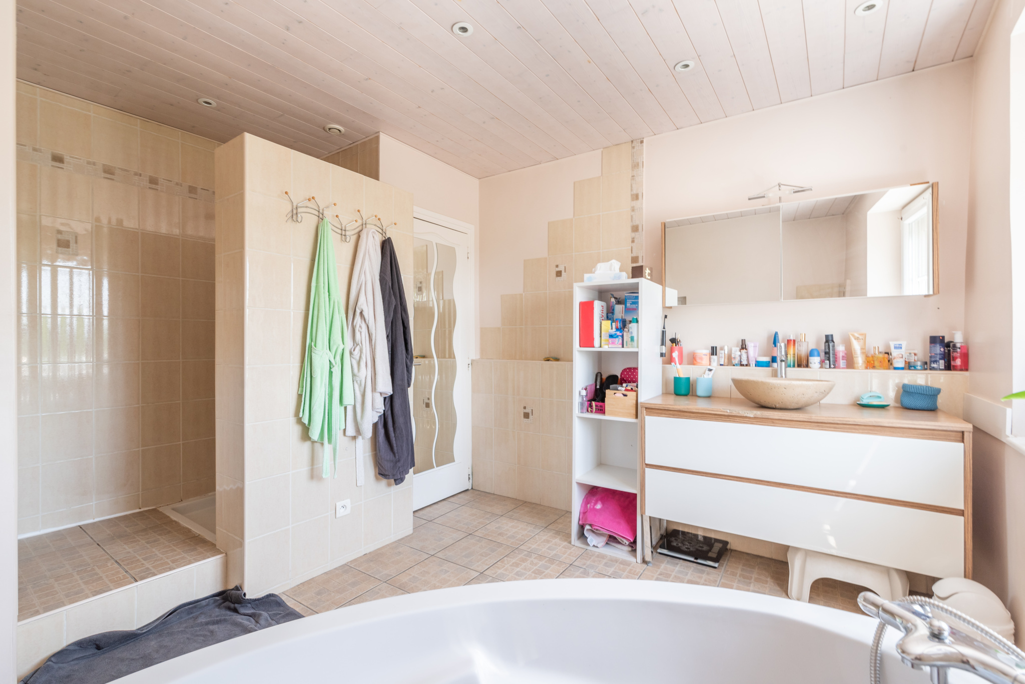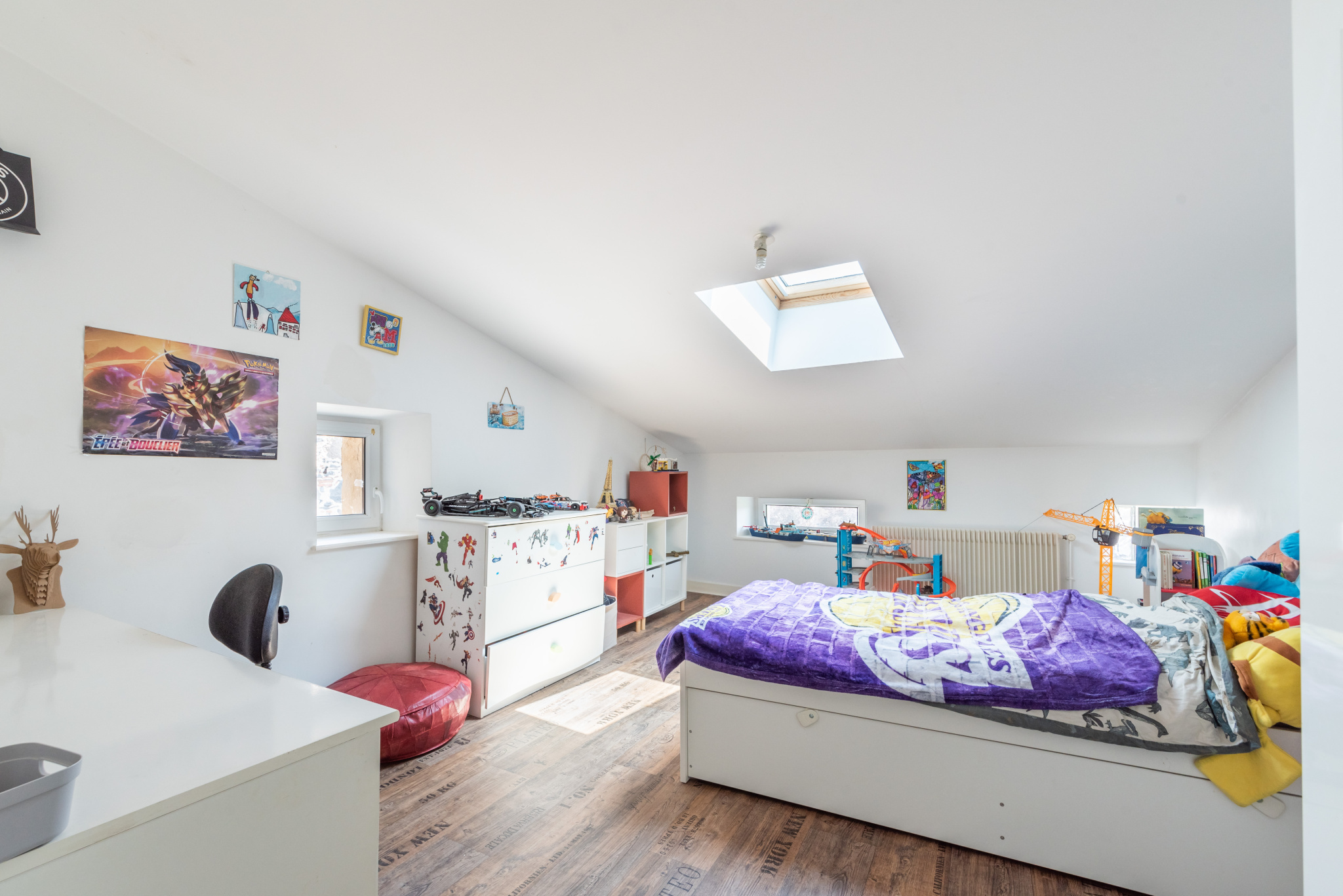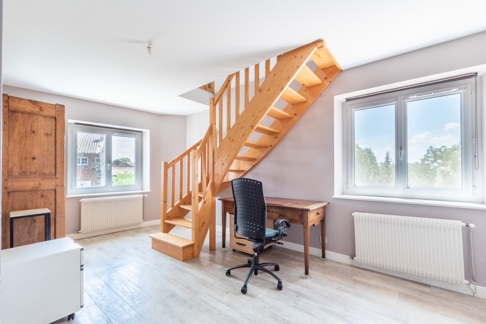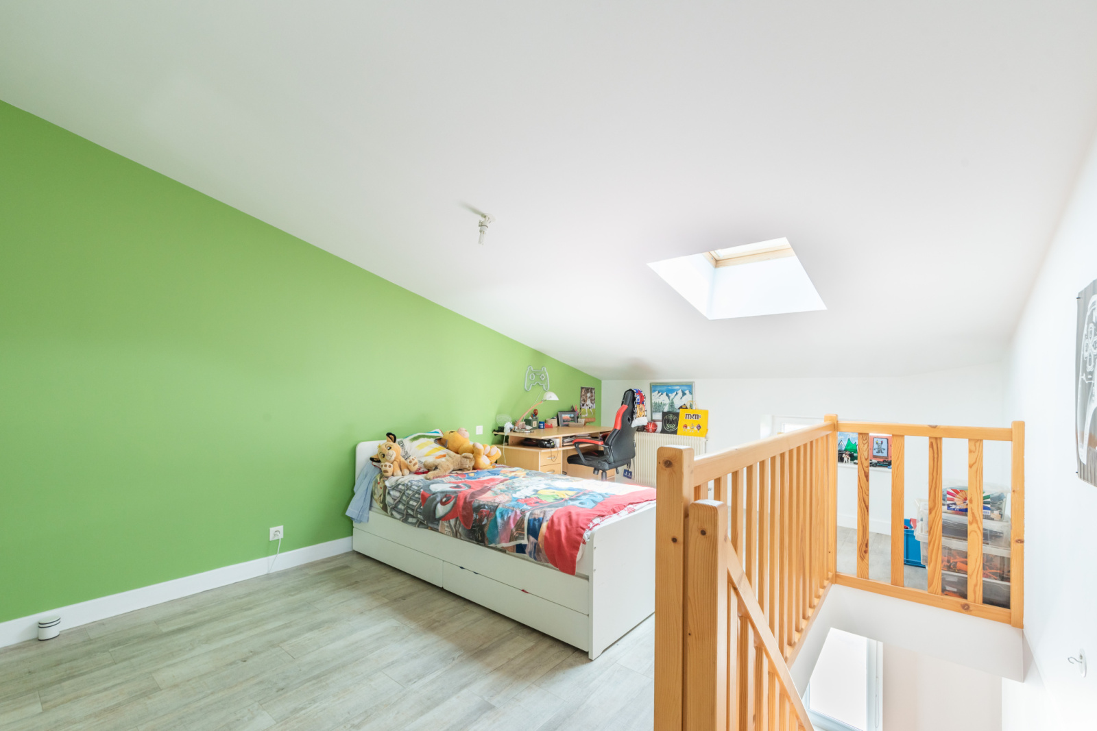 À l’étage, un palier avec coin bureau dessert deux chambres, dont une en mezzanine mansardée. Le niveau supérieur propose deux chambres supplémentaires (dont une mansardée), une grande salle de bain avec douche et baignoire, ainsi qu’un second WC indépendant.