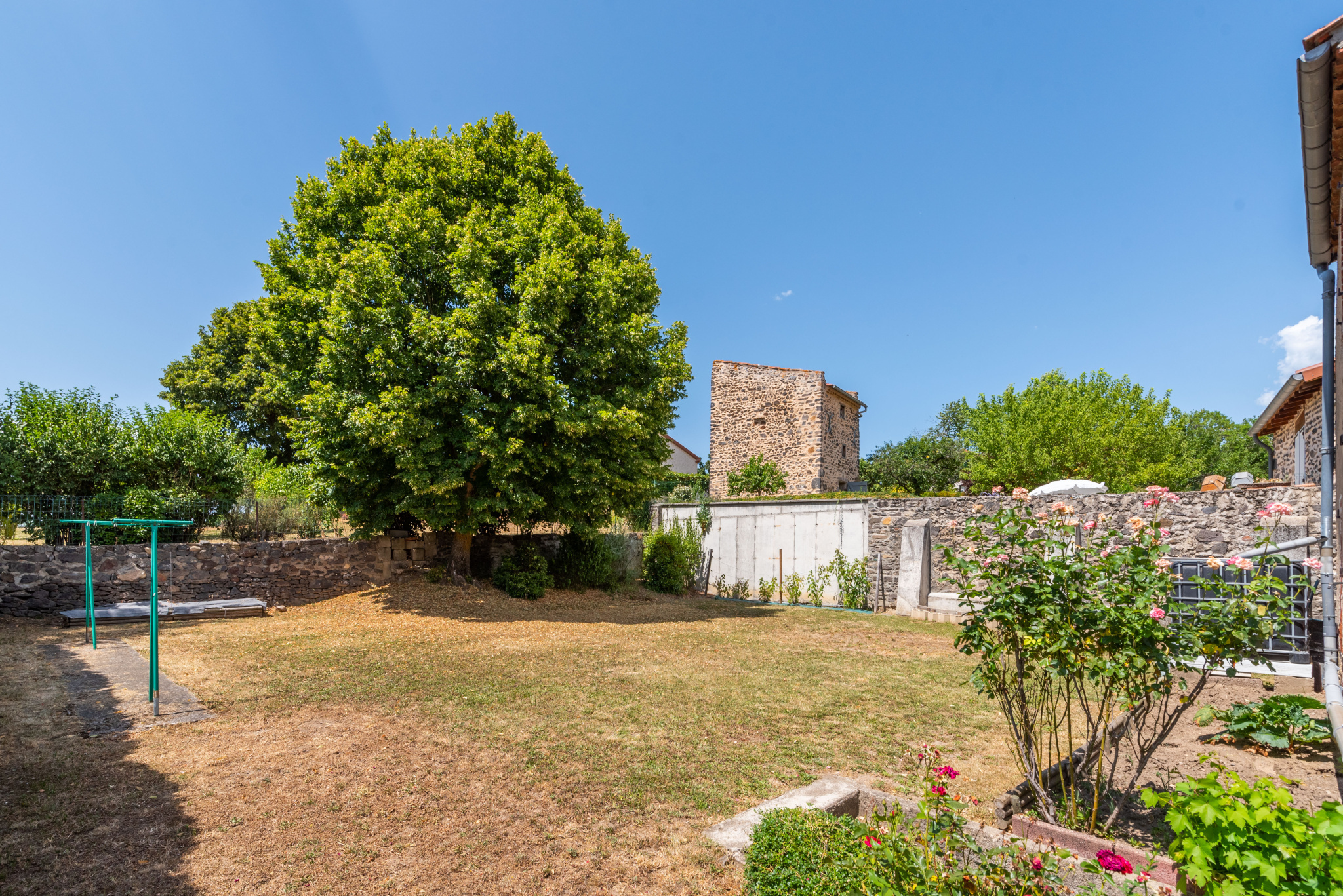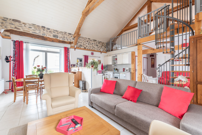 La maison d’habitation séduit par ses volumes et son organisation sur plusieurs niveaux. En rez-de-jardin, une entrée avec espace cellier-vestiaire mène à une cuisine équipée ouverte sur l’extérieur, un vaste séjour chaleureux agrémenté d’un poêle à granulés, une buanderie-chaufferie, un WC indépendant, ainsi qu’un accès à une charmante cave voûtée enterrée.