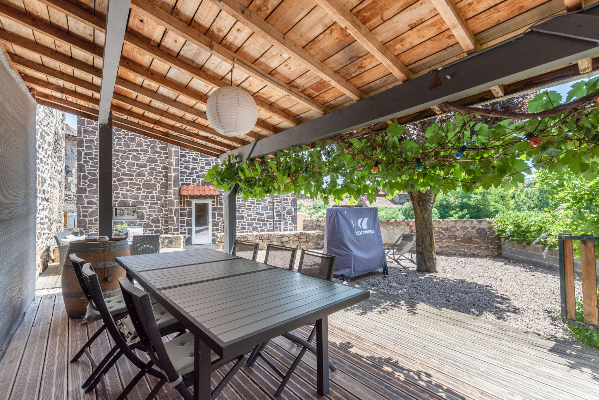 À l’extérieur, vous profiterez d’un agréable parc paysagé, d’un espace détente avec terrasse en bois partiellement couverte, d’un parking pour plusieurs véhicules, ainsi que d’un terrain entièrement clos avec double portail et portillon.