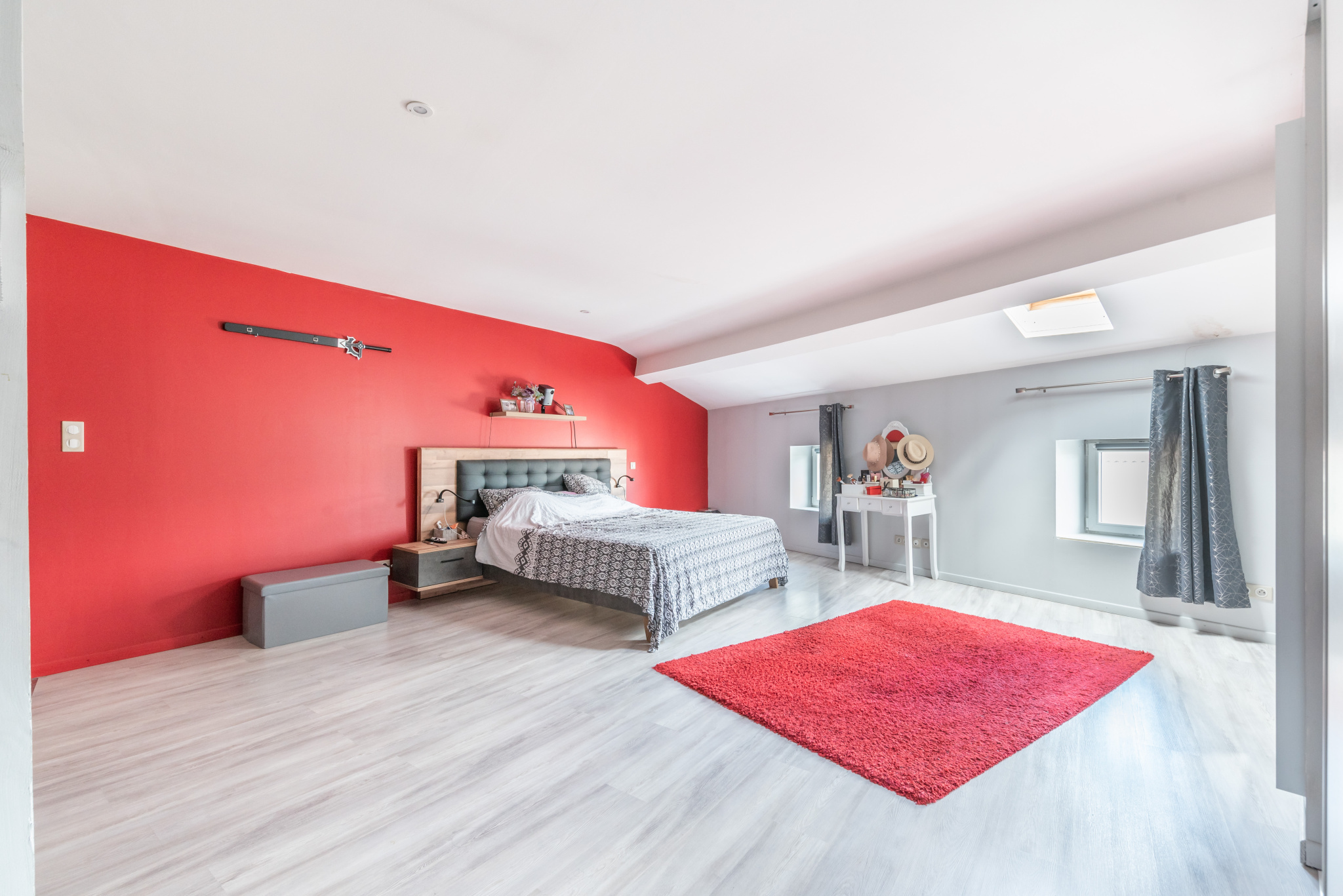Au deuxième étage, en mezzanine ouverte sur le salon, se trouvent une chambre spacieuse avec placard intégré, une salle d’eau et des WC.