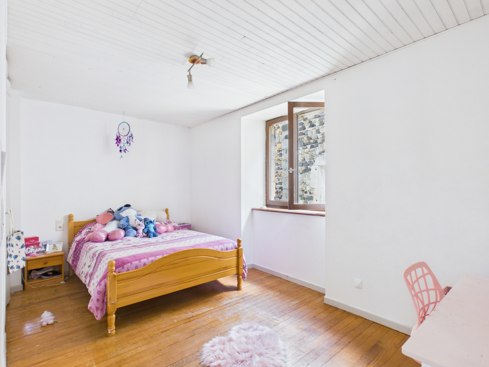 À l’étage, un couloir dessert trois chambres confortables ainsi qu’une salle d’eau-Wc.