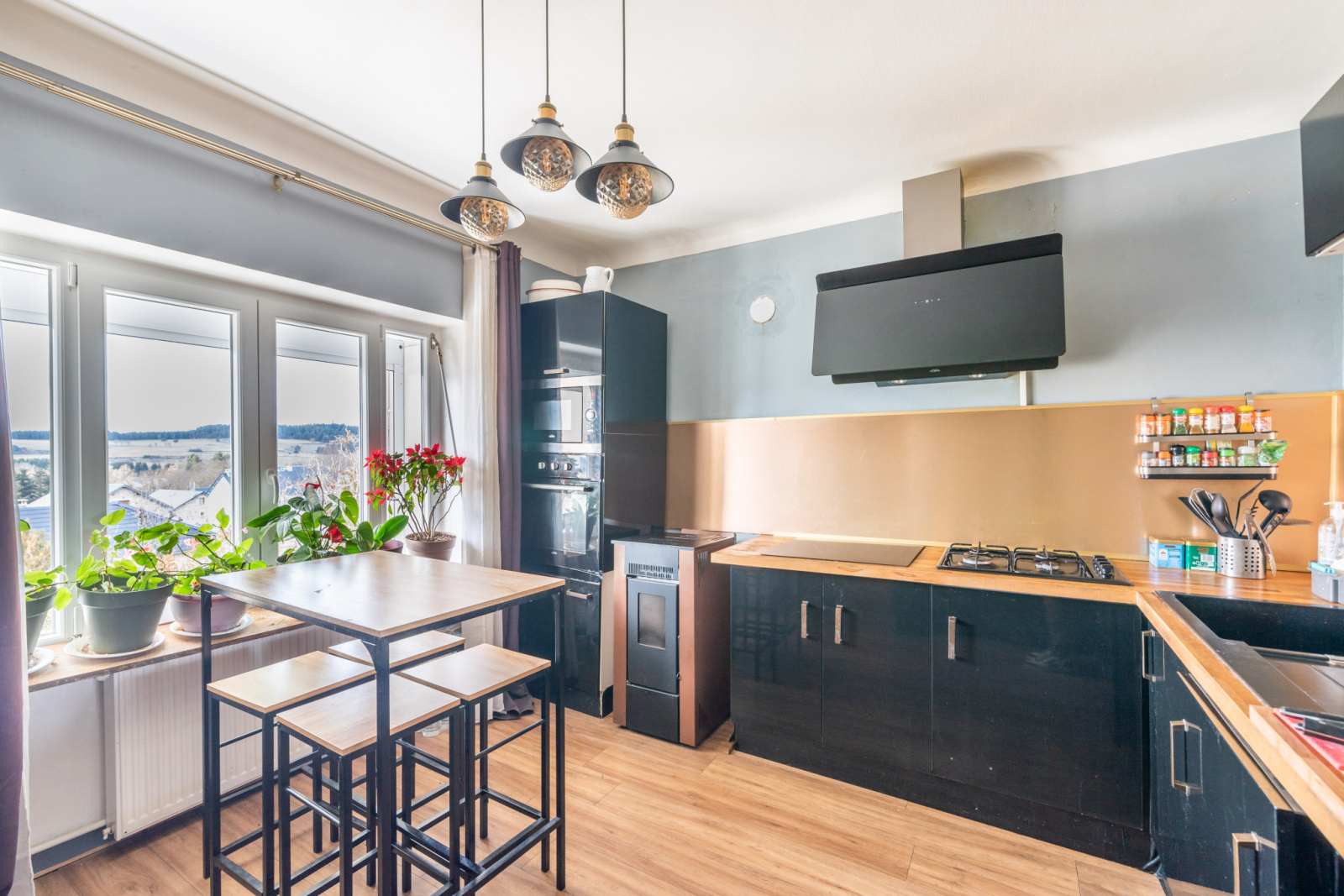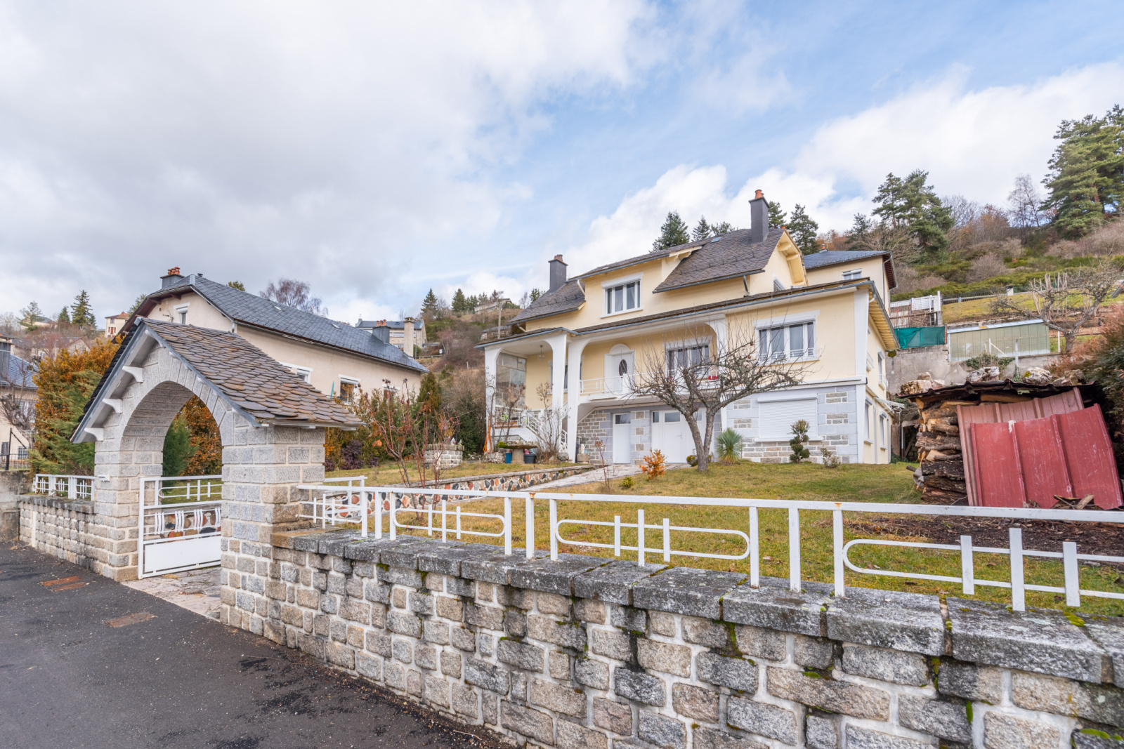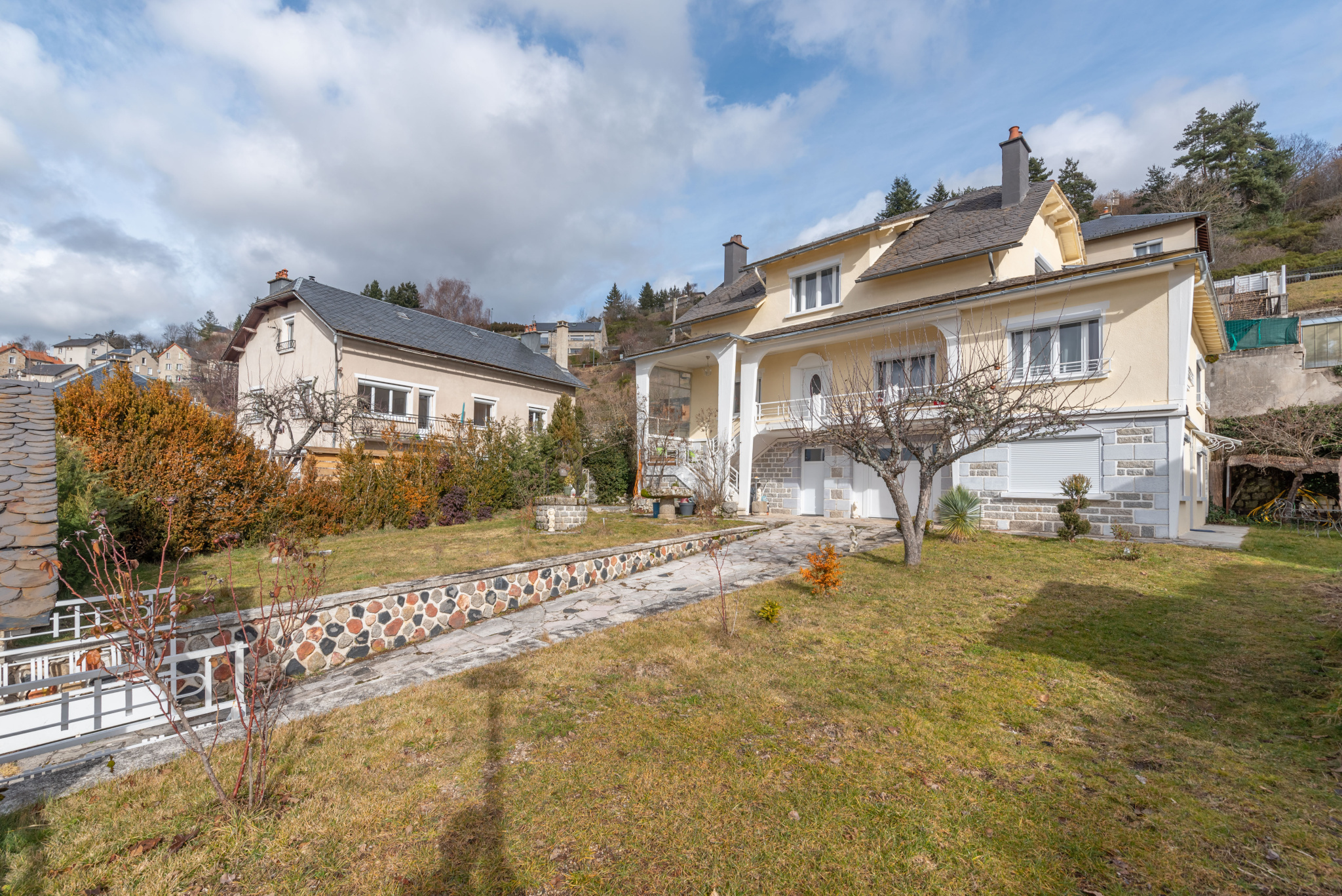 Située en Nord lozère, dans un village très tranquille, dans une voie sans issue refaite à neuf, tout l'assainissement est neuf, tout est enterrer, tuyaux et fils. Maison hétéroclite avec vue dégagée,entierement rénovée, baies et fenêtres Knaus, volet parquet et boiseries, pas de travaux à prevoir. Surface habitable de 166 m2, surface des dépendances garage atelier buanderie 54m2, plus cabane de jardin en dur de 12m2, d'un balcon et d'un espace terrasse protégée par verrière. Cette maison dispose d'un studio indépendante de 28m2 compris dans les 166 m2 avec terrasse privée. En bas vous avez un salon, salle de maison, un bureau, une cuisine, placard salle de bain et toilette. Cette maison possède trois entrées, ce qui favorise l'installation très facilement d'un cabinet de consultation, ou entreprise. Les trois chambres possèdent un dressing et une salle de bain et WC complète ce niveau Cette maison bénéficie d'un système de chauffage combiné de production d'eau chaude solaire couplé à la chaudière au fioul prévoir 1200 litres à l'année. Un ballon d'eau chaude 250 L tampon est en place en cas de secours ou de panne Le chauffage central été refait en 2020, il comprend deux poêles à granules qui sont disposés pour aider juste pour les grands froids (moyenne de 20 sacs l'année). Cette maison est clos d'un muret de pierre entourant toute la maison, ainsi qu'un porche en pierre, les deux pelouses sont arborés, derrière la maison un potager avec des allées cimentés