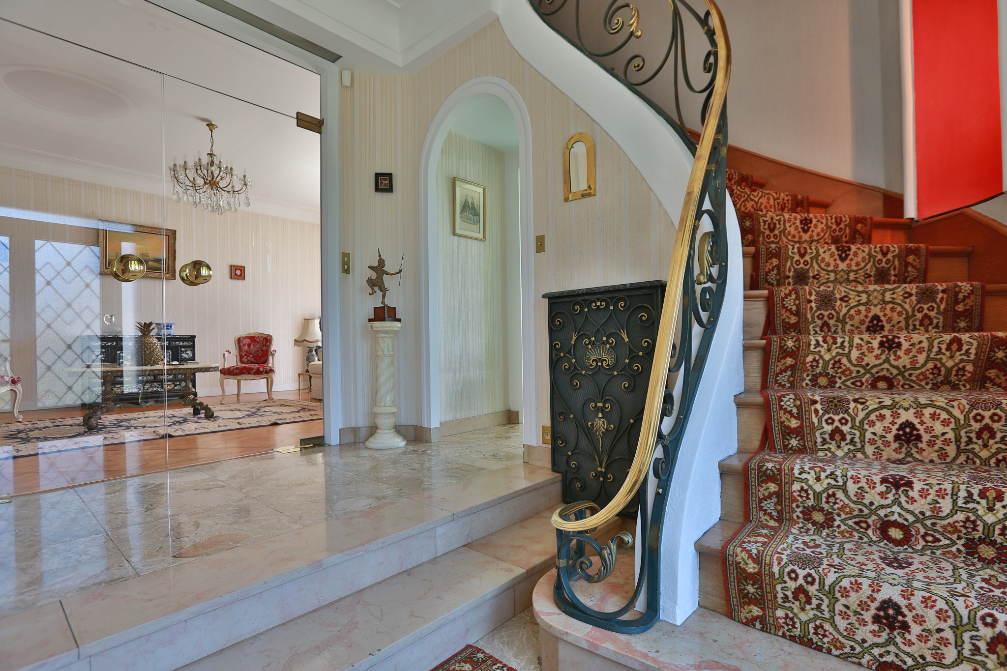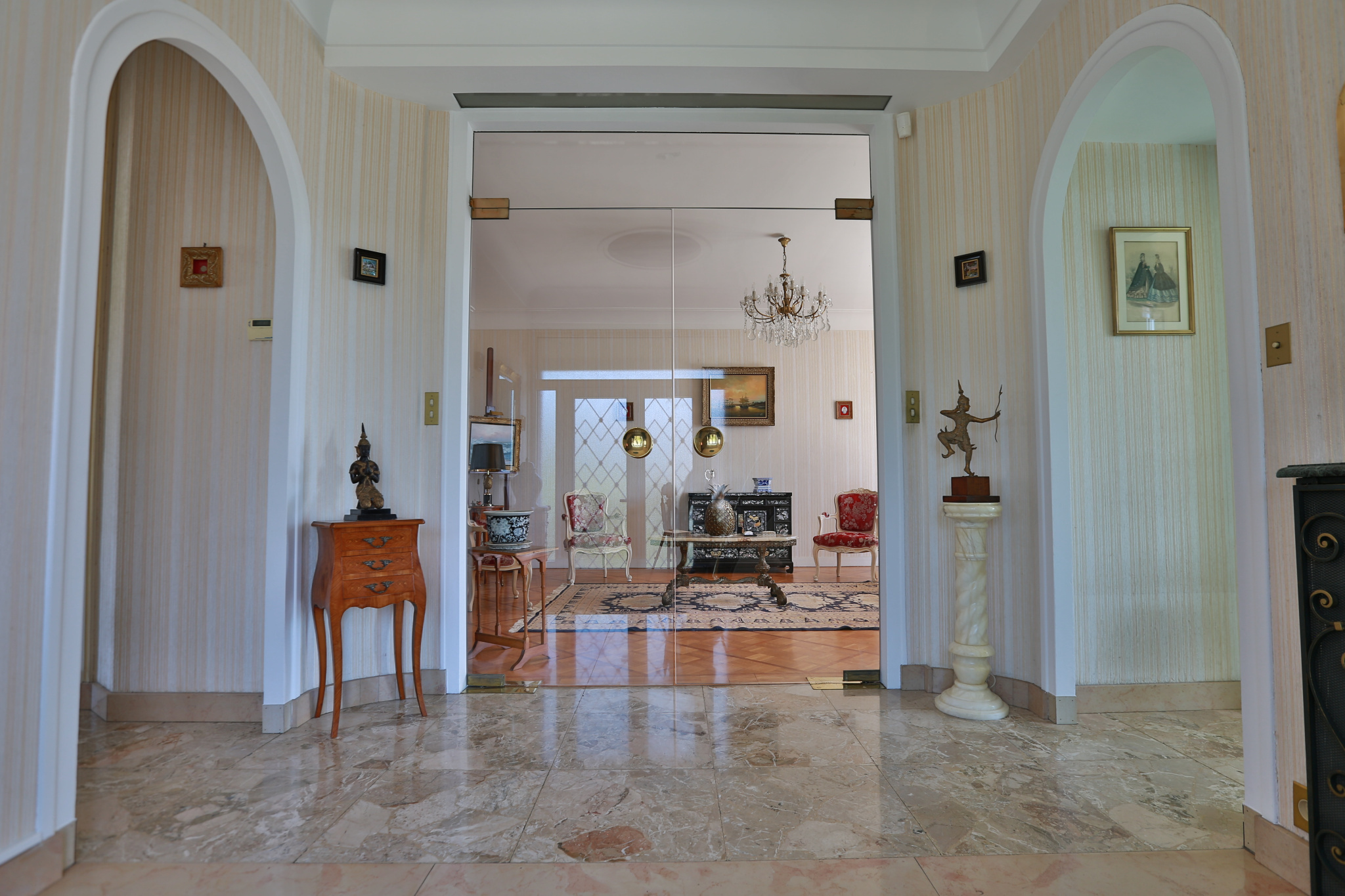 Au rez-de-chaussée, un hall en marbre mène à une pièce de vie traversante de 45 m² avec parquet et accès direct à une terrasse plein sud.